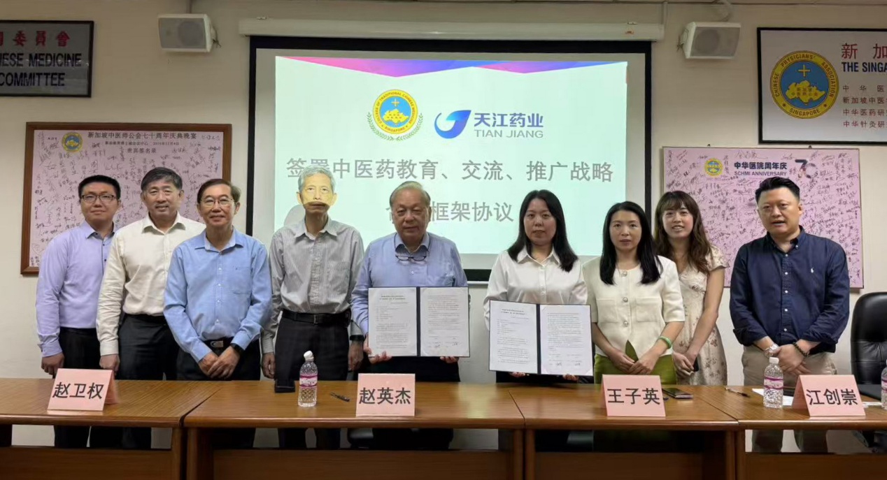 In 2025, Tianjiang Pharmaceuticals and Singapore College of Traditional Chinese Medicine formally signed a strategic cooperation framework agreement in Singapore, launching comprehensive collaboration in TCM education, international exchange, and promotion. Representatives from Tianjiang Pharmaceuticals and Mr. TEO ENG KIAT, President of Singapore College of TCM, attended the signing ceremony.
